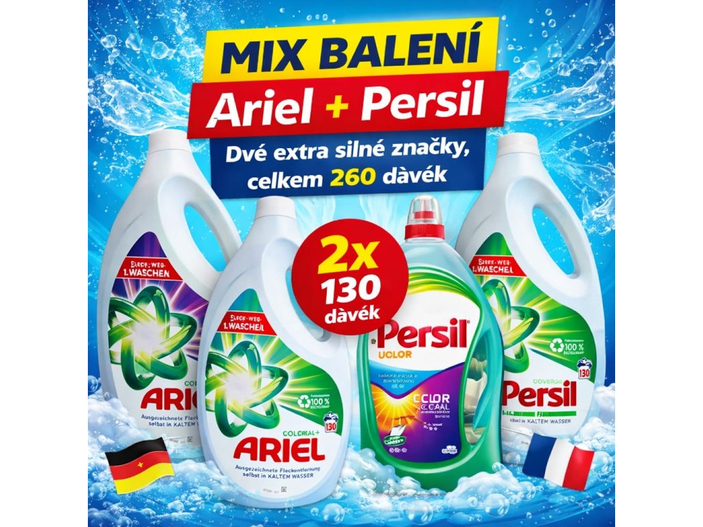 🟢 Mix balení – Ariel Color + Persil Color (2× 130 dávek)Dvě špičkové značky v jednom výhodném balení. Ariel Color + Persil Color je ideální kombinace pro dokonale čisté a zároveň zářivě barevné prádlo.Získáváte sílu dvou německých pracích gelů, které patří mezi absolutní špičku v účinnosti a ochraně barev.✅ Co získáte:✔️ 1× Ariel Color – 130 dávek✔️ 1× Persil Color – 130 dávek✔️ Celkem až 260 praní✔️ Silný účinek proti skvrnám✔️ Ochranu barev před vyblednutím✔️ Účinnost i při nízkých teplotáchPerfektní řešení pro rodiny, které chtějí vyzkoušet oba produkty nebo kombinovat podle typu prádla.Typ: tekuté prací gely na barevné prádloCelkový počet praní: až 260 dávek